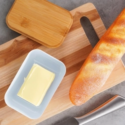 Het stevige bamboe deksel sluit de boter betrouwbaar af en kan ook dienen als klein snij- of serveeroppervlak.