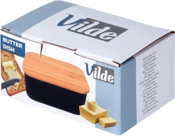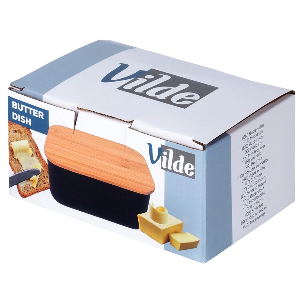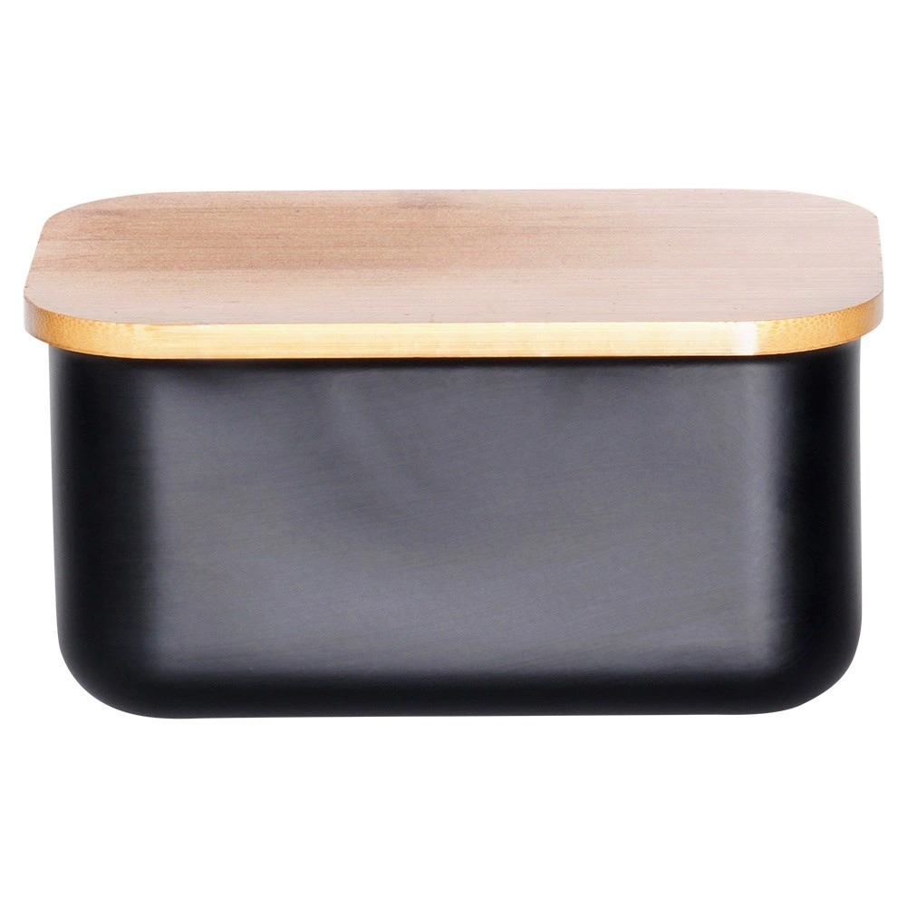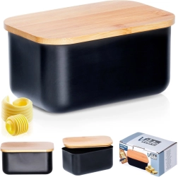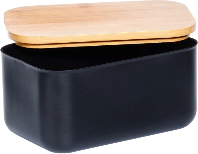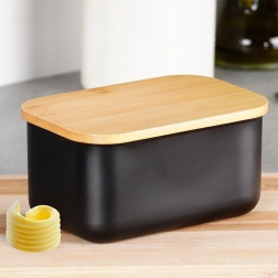 Deze stijlvolle botervloot is gemaakt van kwaliteitsstaal met een matzwarte afwerking en afgewerkt met een bamboe deksel. Zo combineert hij modern uiterlijk en functionaliteit – de boter blijft beschermd tegen lucht en geuren uit de koelkast, zodat ze langer vers en smakelijk blijft.