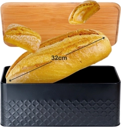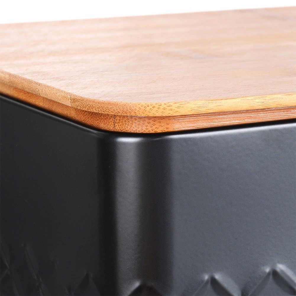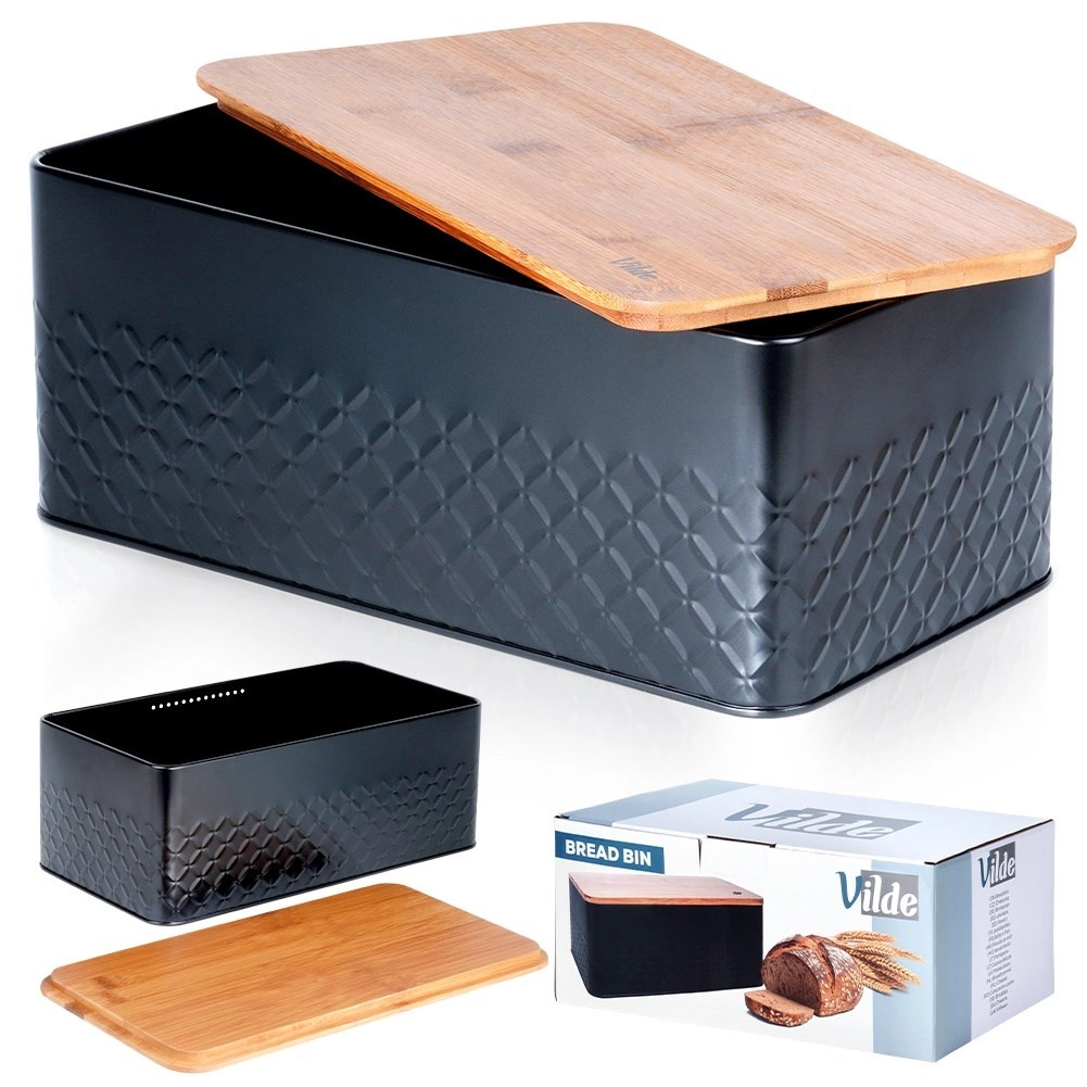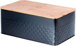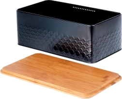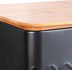 De stijlvolle broodtrommel combineert een duurzame, poedergecoate metalen behuizing in matzwart met een natuurlijk bamboe deksel. Het deksel kun je gebruiken als praktische snijplank, zodat je direct kunt snijden waar je het brood bewaart. Het design met reliëftextuur geeft de broodtrommel een moderne uitstraling en past moeiteloos in zowel een minimalistische als een natuurlijk ingerichte keuken.