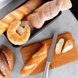 Het bamboe deksel kun je gebruiken om brood en gebak comfortabel te snijden. Ruimtebesparend en altijd bij de hand.