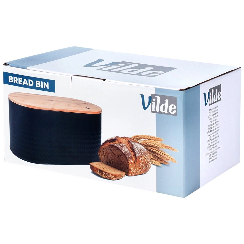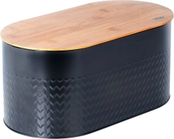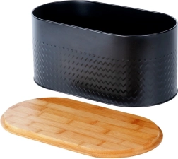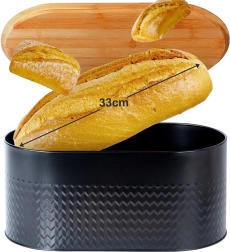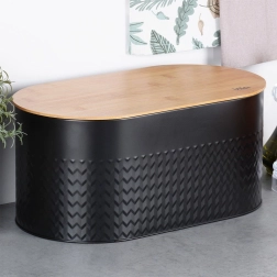 Stijlvolle zwarte broodtrommel van duurzame staal met een deksel van natuurlijk hout, dat tegelijk dient als snijplank. Houdt je brood en gebak langer vers, beschermt tegen uitdrogen en pletten, en vormt een elegante aanvulling op elke keuken. De ovale vorm en afmetingen 34 × 18,5 × 15,5 cm bieden voldoende ruimte voor brood, broodjes en allerlei gebak.