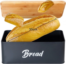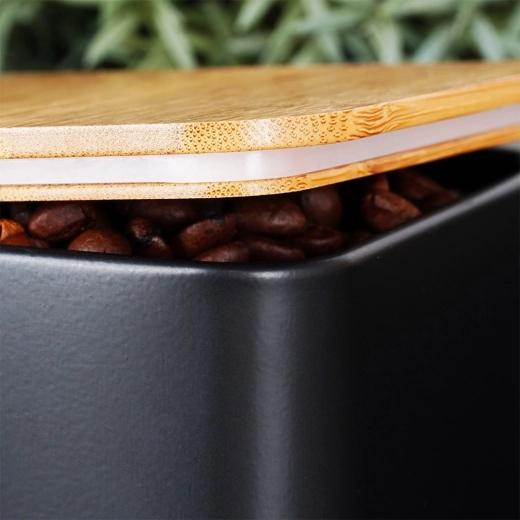 De broodtrommel van duurzaam, poedergecoat metaal kenmerkt zich door strakke lijnen en een praktisch deksel van bamboehout, dat ook kan worden gebruikt als snijplank. De metalen constructie beschermt brood en gebak tegen pletten en beperkt het uitdrogen. Drie bijpassende potten met bamboe deksels houden suiker, koffie en thee langer aromatisch en overzichtelijk opgeborgen.