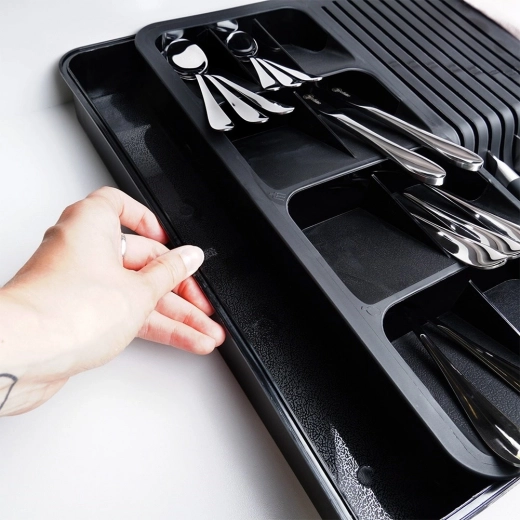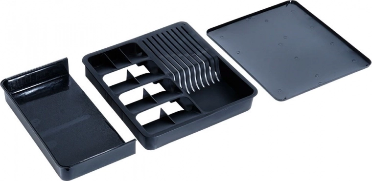 Praktische zwarte inleg-organizer voor lades die je bestek, keukengerei en messen op één plek ordent. Biedt overzichtelijke vakken en een speciale sectie voor tot 9 messen. De basismaten 40 × 31 × 5 cm zijn dankzij het uitschuifbare deel te vergroten tot 45,5 cm voor extra opbergruimte. Gemaakt van duurzaam plastic, eenvoudig te reinigen en houdt elke keuken netjes.