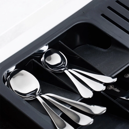Meerdere vakken voor lepels, vorken, messen en langere tools. Alles heeft zijn plek, de lade blijft opgeruimd.