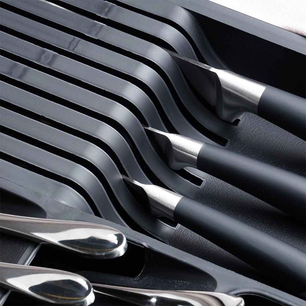 Houd lades perfect geordend. De uitschuifbare inleg-organizer biedt een doordachte indeling van vakken voor lepels, vorken, messen en keukengerei en een toegewijd blok voor veilig opbergen van tot negen messen. Dankzij het uitschuifbare deel pas je de breedte van de opbergruimte eenvoudig aan en benut je elke centimeter van de lade.