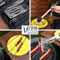 Alles past in de stevige textielen etui met rits en handgrepen, zodat de tools georganiseerd, draagbaar en beschermd blijven. De set is een geweldig cadeau voor elke grillliefhebber en een praktische helper voor tuinfeesten en kamperen.