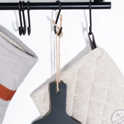 Het geïntegreerde handvat zorgt voor veilig dragen; de juten lus maakt eenvoudig opbergen en decoratief ophangen mogelijk.
