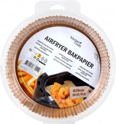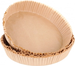 De set van 50 wegwerp inlegvellen voor heteluchtfriteuses maakt dagelijks koken makkelijker. De ronde vorm met verhoogde, geplooide randen behoudt perfect de vorm en beschermt de friteusemand tegen vervuiling. Dankzij het stevige, geoliede papier zijn de vellen antiaanbak, laten ze geen vet of vloeistof door en beïnvloeden ze de smaak van gerechten niet.