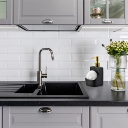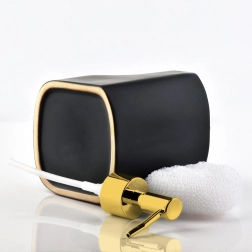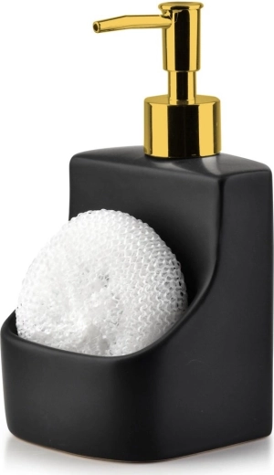 De praktische dispenser voor afwasmiddel combineert een dispenser en een organizer voor de spons in één. Dankzij het geïntegreerde vak hebt u schoonmaakbenodigdheden altijd bij de hand en blijft het werkblad schoon en geordend. Matzwarte keramiek met contrasterende gouden pomp past perfect in moderne, klassieke en industriële keukens.