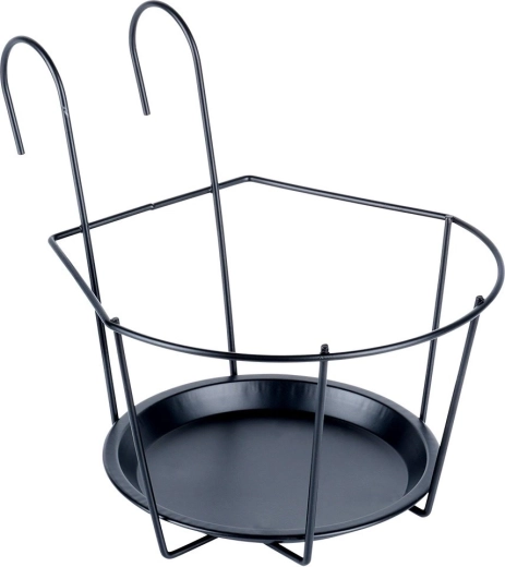 Deze zwarte hanghouder voor een bloempot is ontworpen voor snel ophangen aan balkon- of terrasleuningen. Het robuuste draadframe en de ronde basis met schaal zorgen voor stabiliteit van de bloempot en het opvangen van overtollig water, wat zowel de vloer als de leuning beschermt. De minimalistische uitstraling past gemakkelijk in de buitenruimte en benadrukt de schoonheid van uw planten.