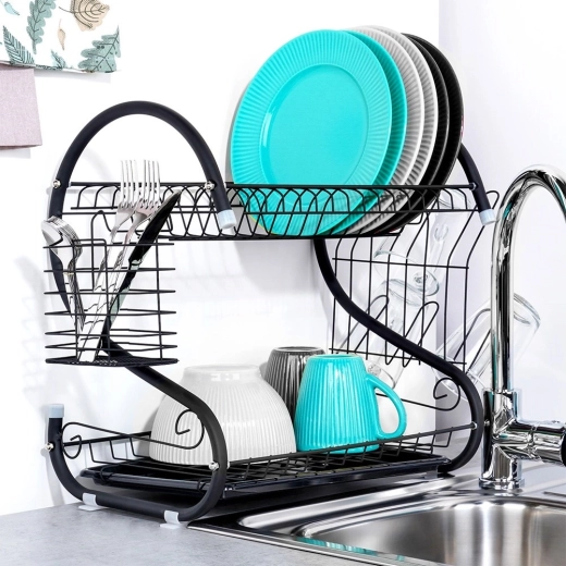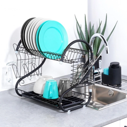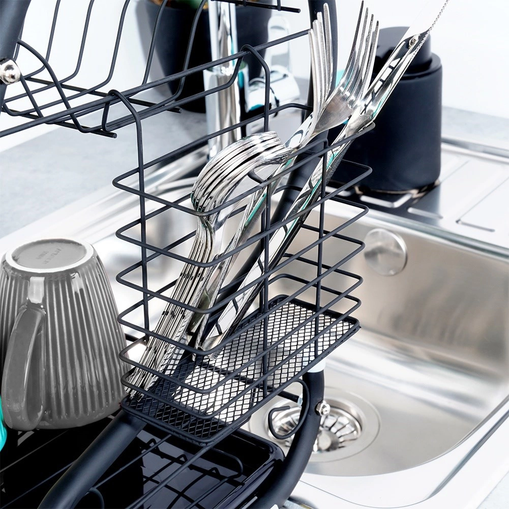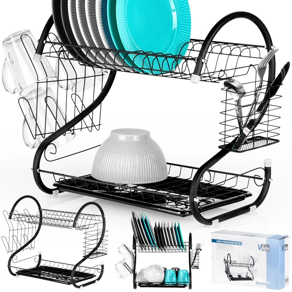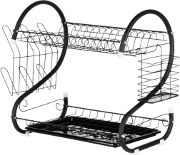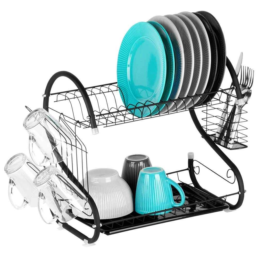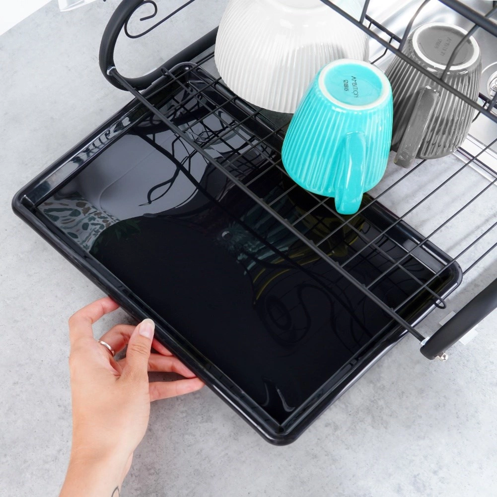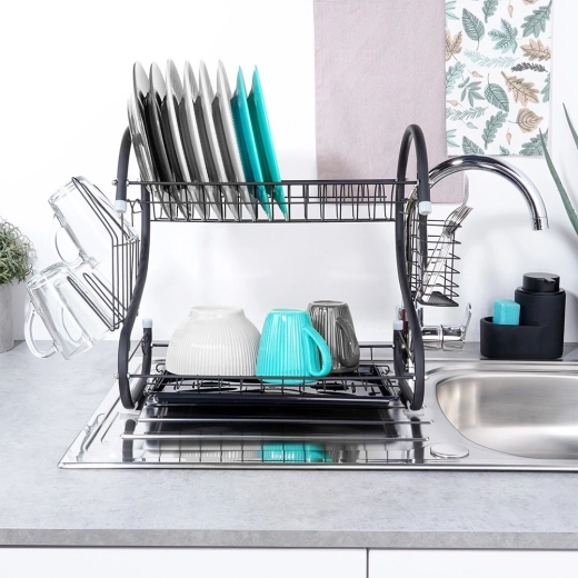 Compact maar uitzonderlijk ruim tweelaags afdruiprek voor servies helpt borden, kommen, glazen en bestek snel te drogen en beschermt tegelijk het werkblad tegen waterdruppels. De duurzame metalen constructie in mat zwart oogt elegant en past perfect in zowel moderne als klassieke keukens.