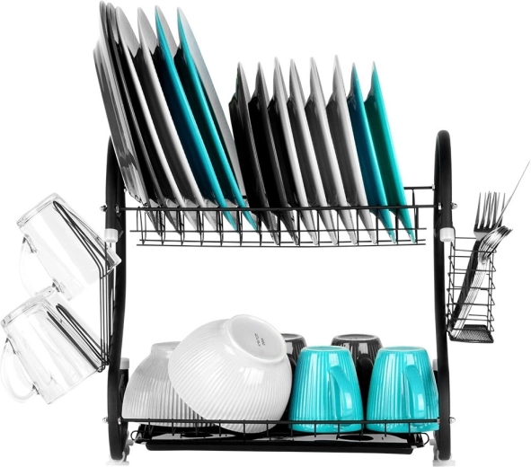 Het bovenste niveau biedt plaats aan tot 14 borden, het onderste aan tot 11 borden of ander servies. Inclusief een afneembare bestekmand, een speciale houder voor een snijplank en praktische handgrepen voor eenvoudig dragen. De uitneembare lekbak maakt onderhoud gemakkelijk en houdt het aanrecht droog.