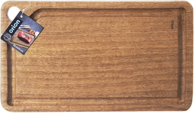 Elegante houten snijplank van mangohout met afmetingen 39,5 × 23 cm en een dikte van 2 cm, ideaal voor dagelijks snijden en serveren. Het natuurlijke mangohout is bestand tegen vocht en vervorming, droogt snel en heeft een prachtige houtnerf. De praktische diepe sapgoot langs de rand vangt sappen van vlees, fruit en groenten op, en de ophangopening maakt opbergen gemakkelijk.