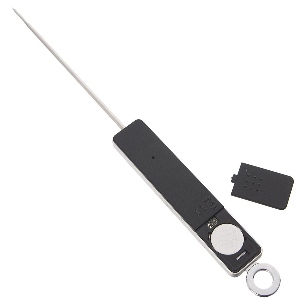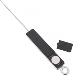 De duurzame uitvoering combineert roestvrij staal en een stevige kunststof behuizing in het zwart. Het praktische beschermkapje voor de sonde maakt veilige opslag en reizen gemakkelijk; het oog maakt ophangen in de keuken mogelijk. Voeding: 1× CR2032-batterij (niet inbegrepen).