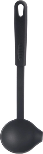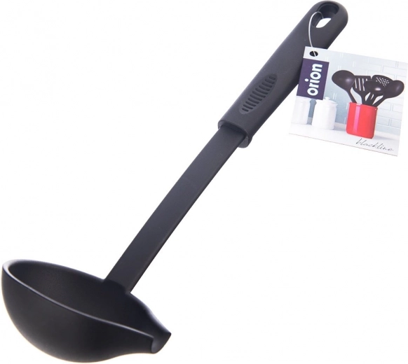 Praktische keukenpollepel met een inhoud van 60 ml en een lengte van 29 cm, gemaakt van duurzaam thermoplast in elegante zwarte kleur. Dankzij de zijkant-tuit kun je soepen, sauzen en goulash nauwkeurig serveren zonder te morsen. Hij is zeer licht, ligt comfortabel in de hand, heeft een ophangoog en is geschikt voor de vaatwasser. Hittebestendig tot 200 °C en tijdloos design uit de BLACKLINE-serie.