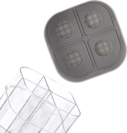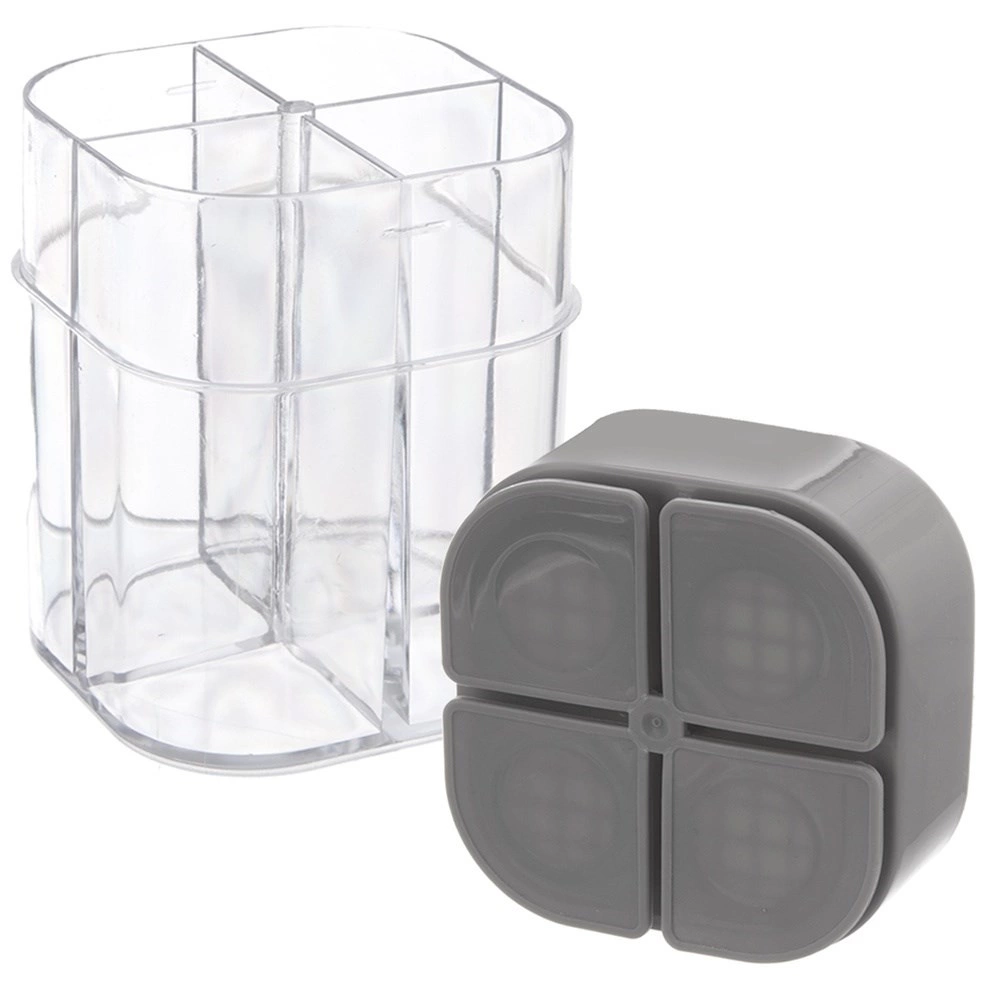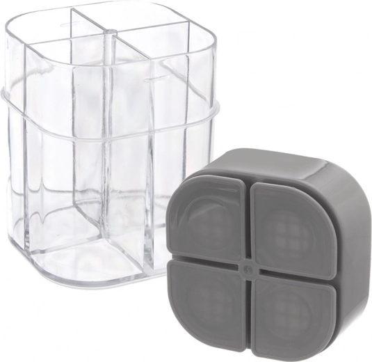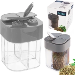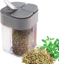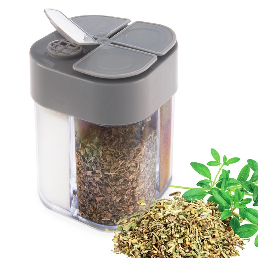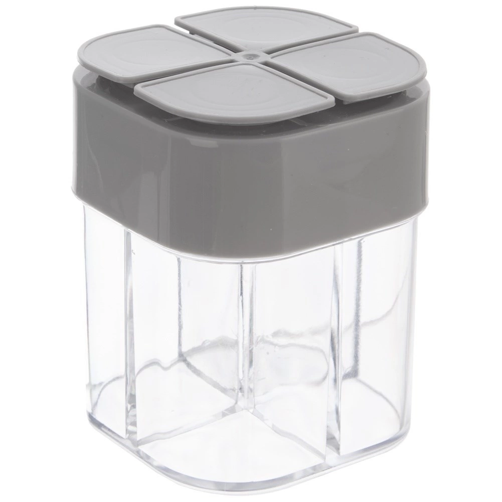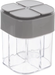 Deze veelzijdige kruidenpot houdt alles netjes en overzichtelijk – in één compacte box (6,5 × 8,5 cm) berg je gemakkelijk vier verschillende soorten kruiden op. De transparante uitvoering maakt directe inhoudscontrole mogelijk en het grijze deksel met meerdere openingen zorgt voor nauwkeurige dosering naar behoefte.