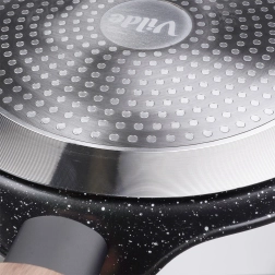 De meerlaagse bodem met inductieplaat verdeelt de warmte over het hele oppervlak van de pan, wat tijd en energie bespaart en een gelijkmatige garing garandeert.