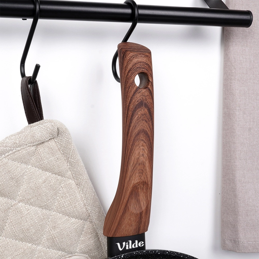 De ergonomische handgreep met houtdecor is antislip, ligt prettig in de hand en heeft een ophangoog. Lage randen en een schenktuit maken het werk eenvoudiger.