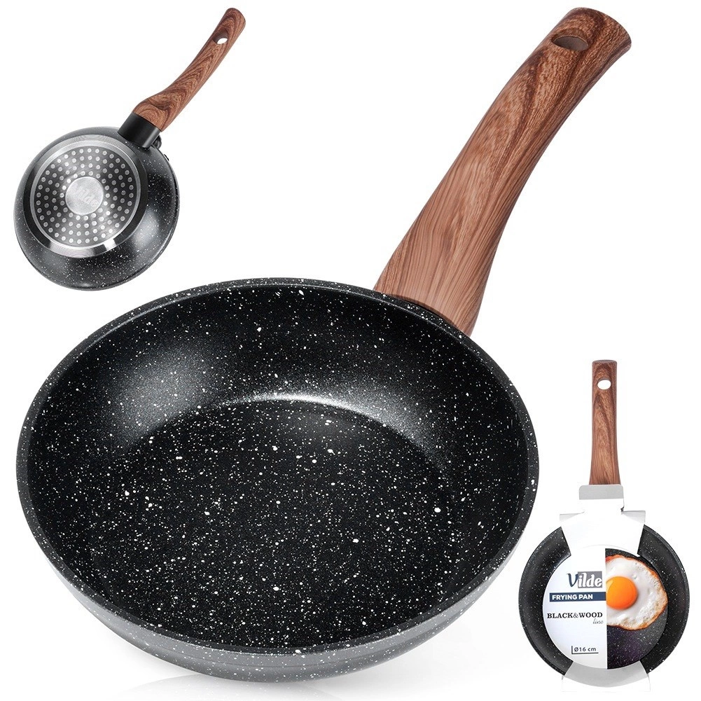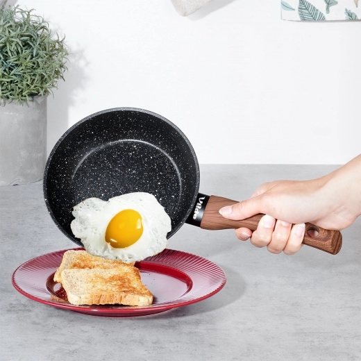 Deze veelzijdige pan van gegoten aluminium met een granieten antiaanbaklaag is ideaal voor bakken en sudderen van kleinere porties – eieren, groenten of vlees. Het stijlvolle ontwerp in zwart met houtlook handgreep past perfect in een moderne keuken en maakt de dagelijkse bereiding van gerechten eenvoudiger.