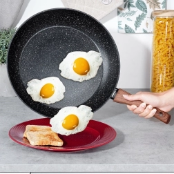 Ontdek de veelzijdige pan BLACK & WOOD, die duurzaam gegoten aluminium combineert met een moderne granieten antiaanbaklaag. Dankzij de royale diameter van 32 cm bereidt u moeiteloos porties voor het hele gezin, en dat met een minimale hoeveelheid olie. Het stijlvolle zwarte design met houtdecor past perfect in elke keuken.