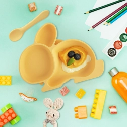 Maak van elke maaltijd plezier en overzicht. Het siliconen bord in de vorm van een konijntje met 3 secties helpt om gevarieerde maaltijden overzichtelijk en hygiënisch te serveren. De grote zuignap aan de onderzijde hecht stevig aan tafel of kinderstoel en verkleint het risico op morsen.