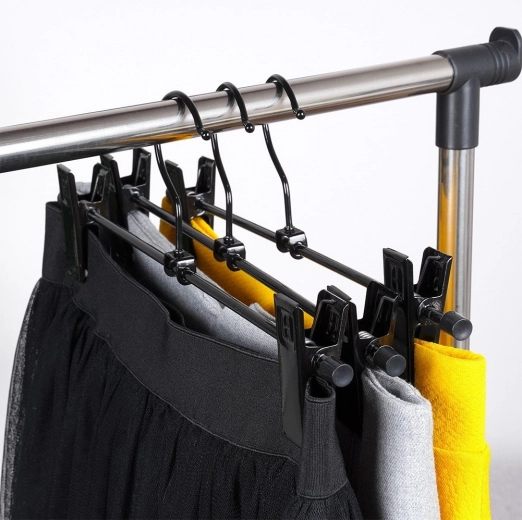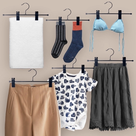 Elke hanger biedt verstelbare klemmen om de breedte aan te passen aan verschillende maten – van kinderkleding tot dames- en herenbroeken, rokken of shorts. Ruimtebesparing en bescherming tegen kreuken zorgen voor een nette uitstraling van uw kleding.