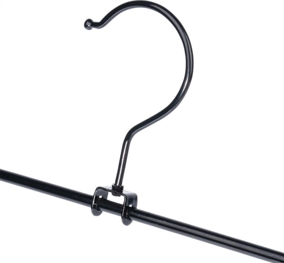 De set van 3 robuuste hangers met klemmen is ideaal voor een overzichtelijke garderobe. Verstelbare klemmen met beschermende inlays houden stof stevig vast zonder schade en voorkomen wegglijden. Het zwart poedergecoate metaal is onderhoudsvriendelijk en staat elegant in elke kast.