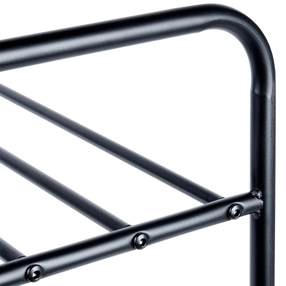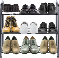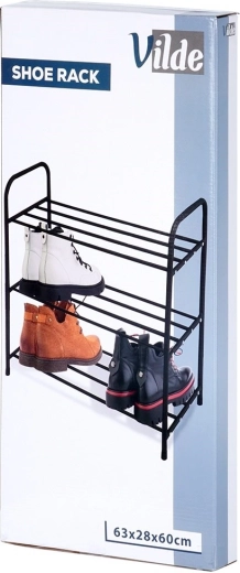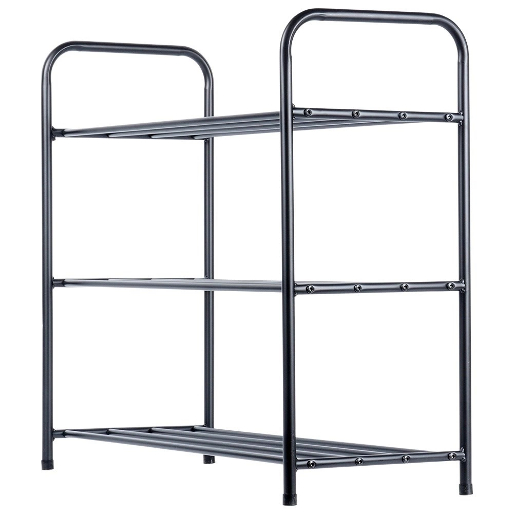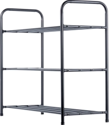 Dit drievoudige metalen schoenenrek zorgt voor orde en overzicht in uw huishouden. De open constructie met buisroosters maakt luchtcirculatie mogelijk en houdt schoenen geventileerd en snel bereikbaar. Het robuuste frame van poeder gecoat metaal in matzwart is stabiel en duurzaam, maar toch licht voor eenvoudig verplaatsen.