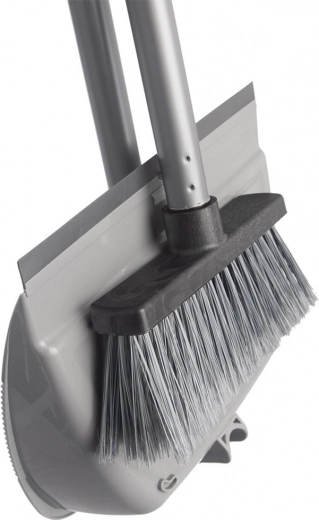 De stoffer met rubberen rand sluit strak aan op de vloer, de handveger met dichte haren verzamelt efficiënt stof, kruimels en haren.