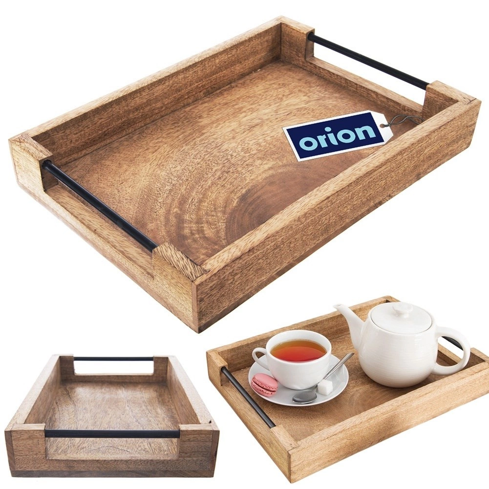 Stijlvol houten serveerblad van mangohout met afmetingen 35,5 × 25,5 × 5,5 cm voor het comfortabel serveren van dranken en desserts. Het heeft een stevige constructie, verhoogde randen en zwarte metalen handgrepen voor veilig dragen. Mangohout is vochtbestendig, droogt snel en neemt geen geuren op. Perfect voor thuis en in de horeca en past bij de industriële LOFT-stijl.