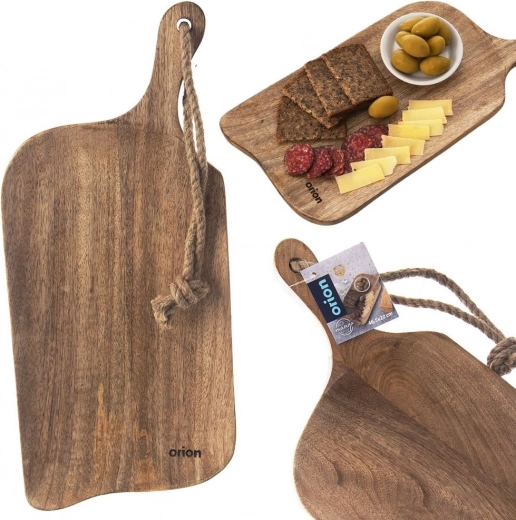 Stijlvolle en duurzame snijplank van mangohout voor dagelijks snijden en elegant serveren. Voorzien van een praktisch handvat met koord om op te hangen, afmetingen 44,5 × 20 cm en een dikte van 2 cm. Mangohout is van nature vochtbestendig, droogt snel en heeft een prachtige natuurlijke nerf. Geschikt voor bereiding en het serveren van kazen, vleeswaren en snacks.