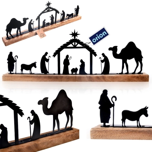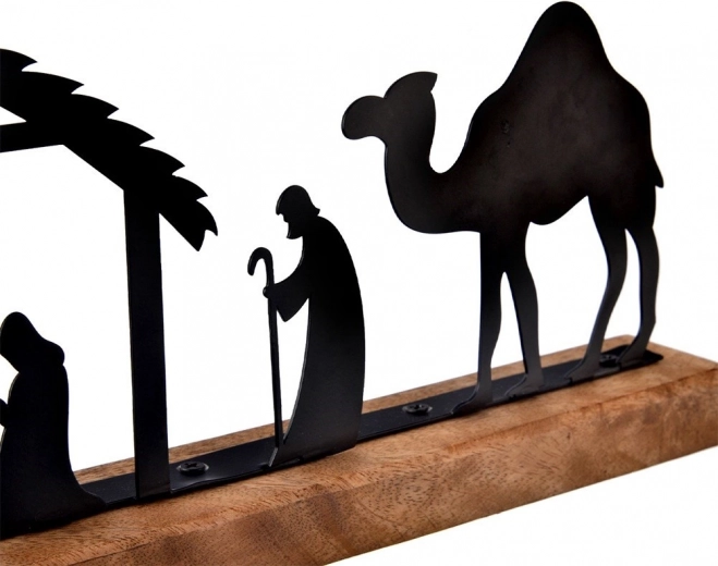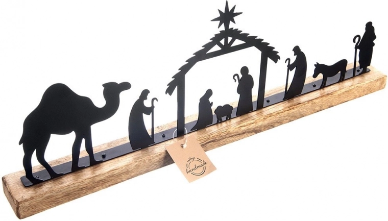 Deze zorgvuldig vervaardigde kerststal valt op door de strakke lijnen van de metalen silhouetten en de natuurlijke look van mangohout. Dankzij de compacte afmetingen van 51 × 5 × 18 cm past hij perfect op de schouw, vensterbank, commode of als tafeldecoratie. Het minimalistische design past prachtig bij zowel moderne als traditionele interieurs en onderstreept de kerstsfeer.