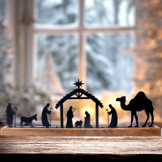 Fijn gelaserde zwarte silhouetten van de stal, de Heilige Familie, herders, dieren en een kameel creëren een opvallend maar ingetogen feestelijk motief.