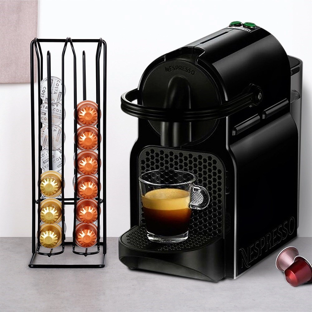 Elegante en stabiele capsulehouder compatibel met NESPRESSO, biedt plaats aan 32 capsules in vier rijen. Heeft compacte afmetingen van 12,5 × 10 × 30 cm, is gemaakt van hoogwaardig zwart metaal en zorgt dankzij de praktische constructie voor snelle toegang tot favoriete smaken, ruimtebesparing op het aanrecht en een stijlvolle uitstraling van je keuken.