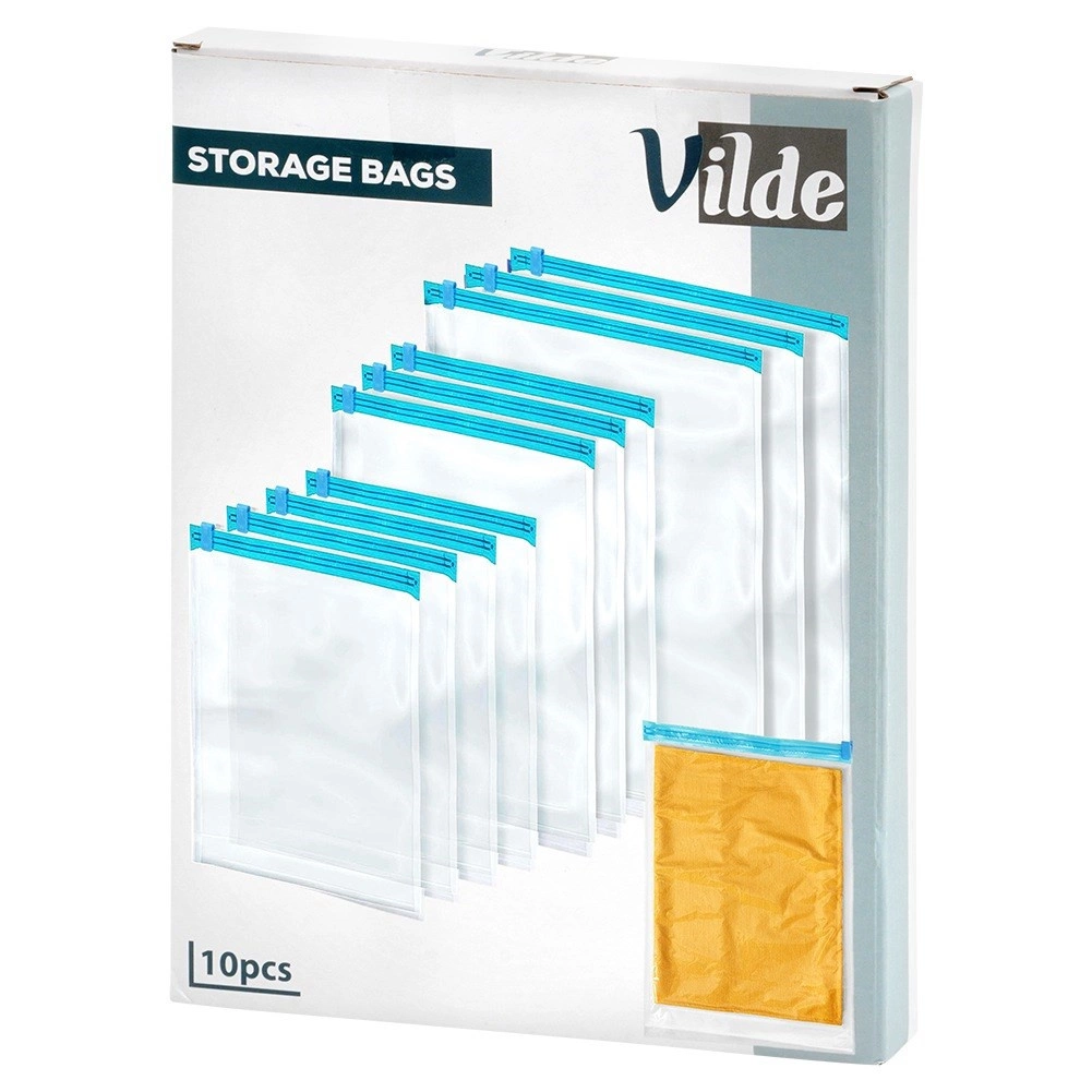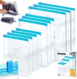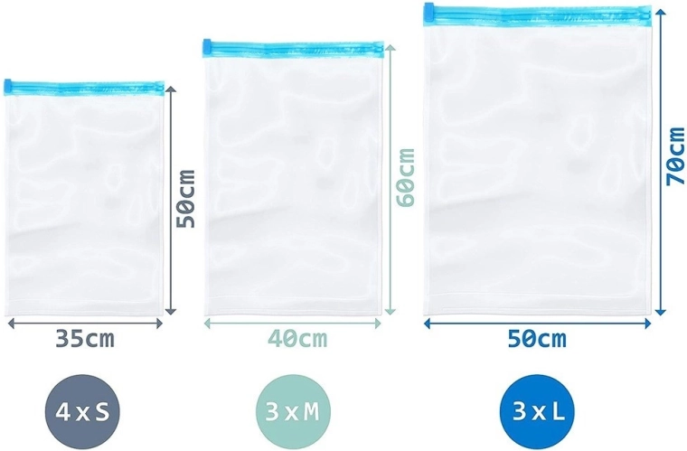 De set bevat 10 duurzame compressiezakken met een betrouwbare schuifrits voor herhaald gebruik. Dankzij drie maten berg je T-shirts, truien, jassen en accessoires moeiteloos op, zowel in de reiskoffer als in de kast thuis. Het transparante materiaal maakt snelle controle van de inhoud mogelijk zonder te openen.