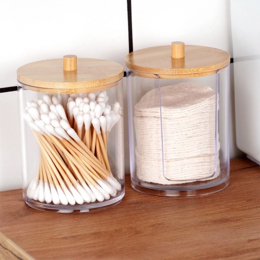 Deze compacte houder met een diameter van 7 cm en een hoogte van 10 cm is gemaakt van sterk, transparant acryl, zodat je altijd ziet hoeveel watjes er over zijn. Het bamboe deksel met comfortabele greep beschermt de inhoud tegen stof en geeft een natuurlijke, elegante look.