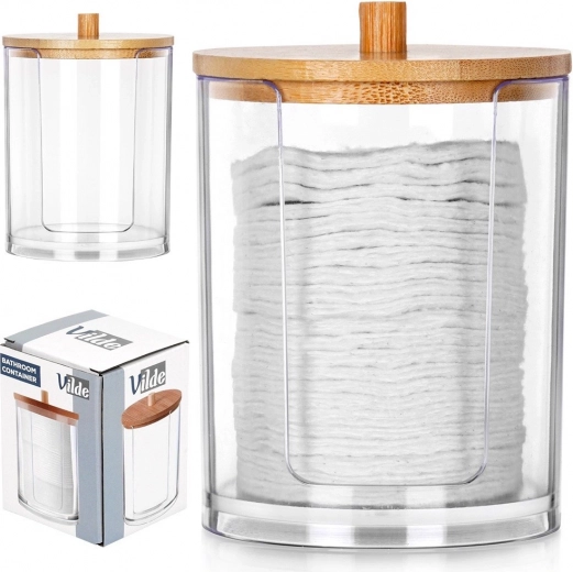 Stijlvolle houder voor watjes van helder acryl met een bamboe deksel houdt je watjes schoon en binnen handbereik. Dankzij de praktische dispenser trek je eenvoudig één watje uit zonder de hele pot te openen, de transparante wanden tonen de resterende hoeveelheid en het moderne, minimalistische design past in elke badkamer.