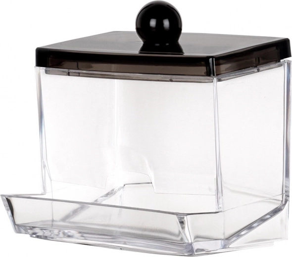 Deze compacte dispenser voor wattenstaafjes combineert helder acryl voor snelle visuele controle van de voorraad met een afsluitbaar deksel met comfortabele greep, dat neerslaand stof betrouwbaar tegenhoudt. De uitsparing aan de voorkant maakt snel en hygiënisch uitnemen van één staafje mogelijk zonder de hele box te openen.