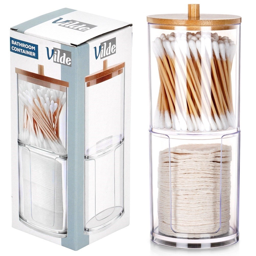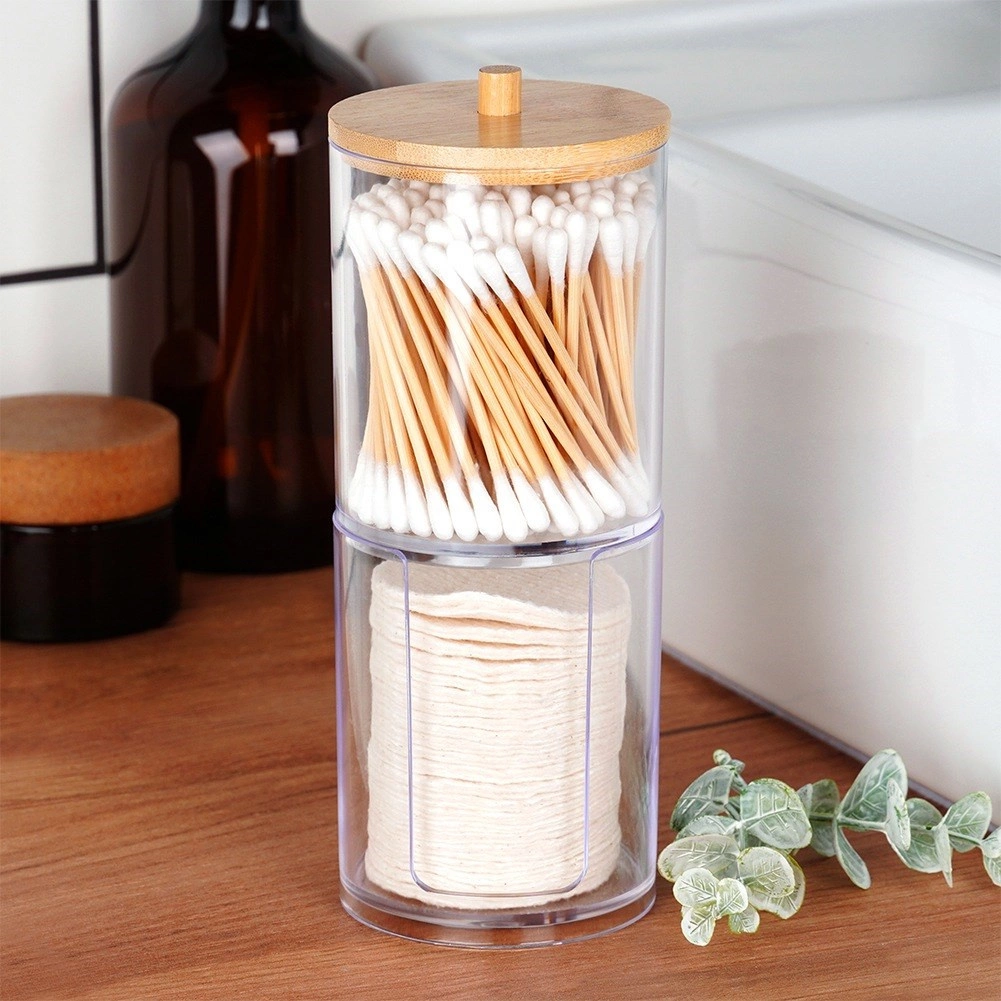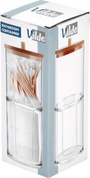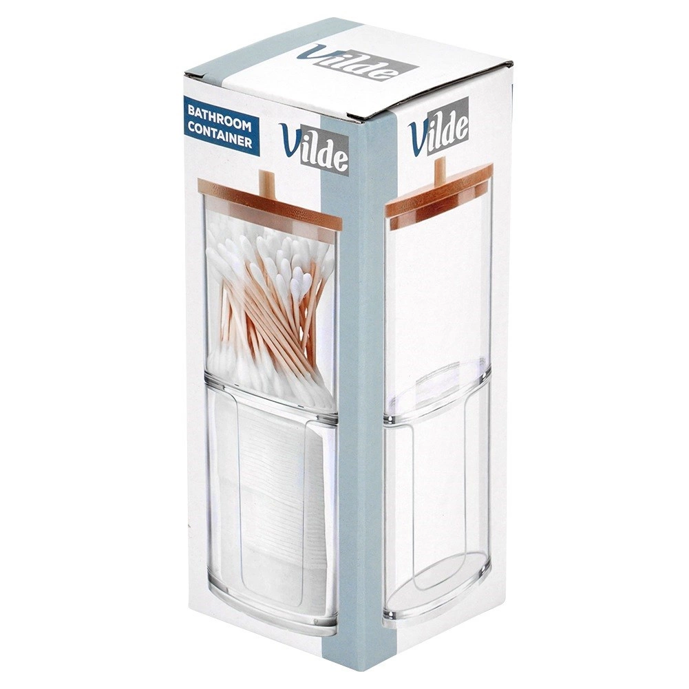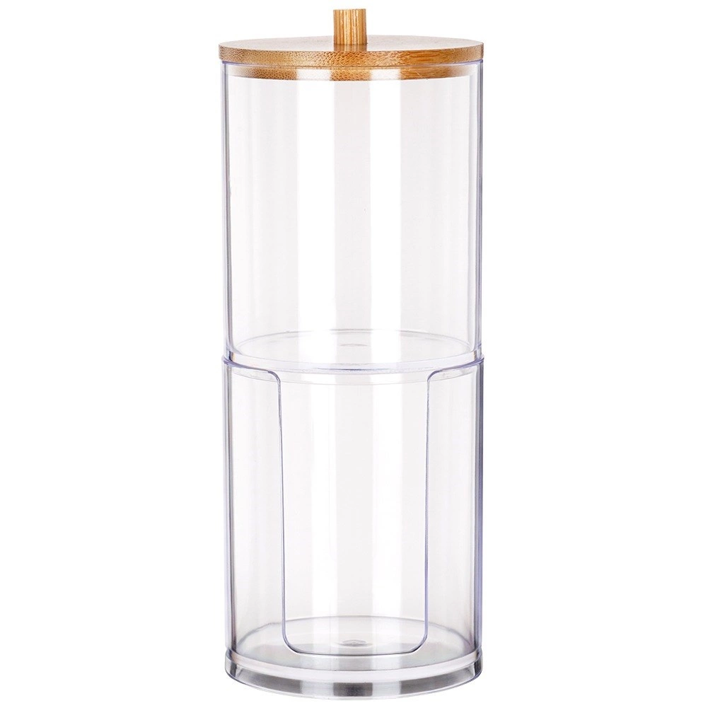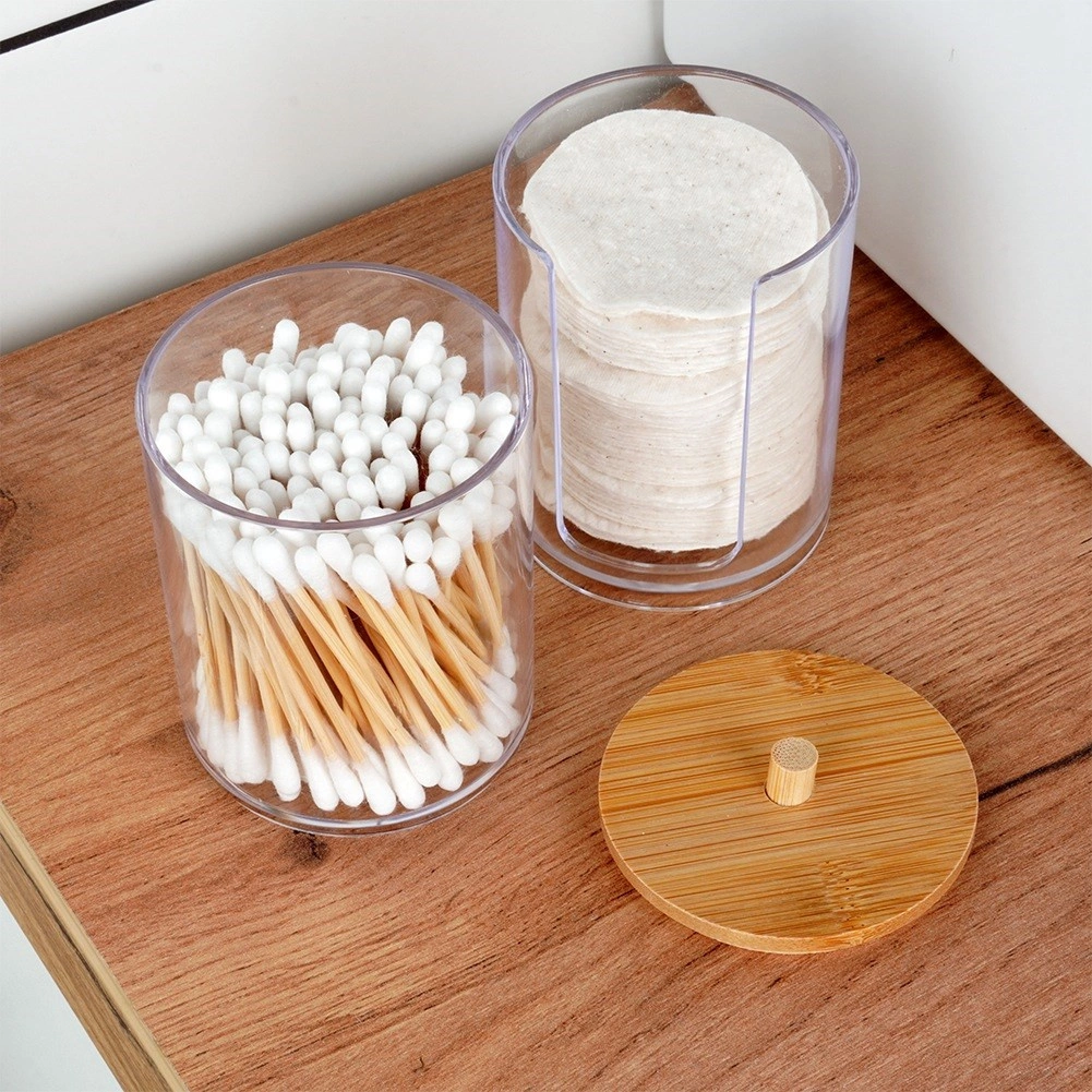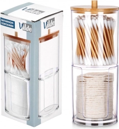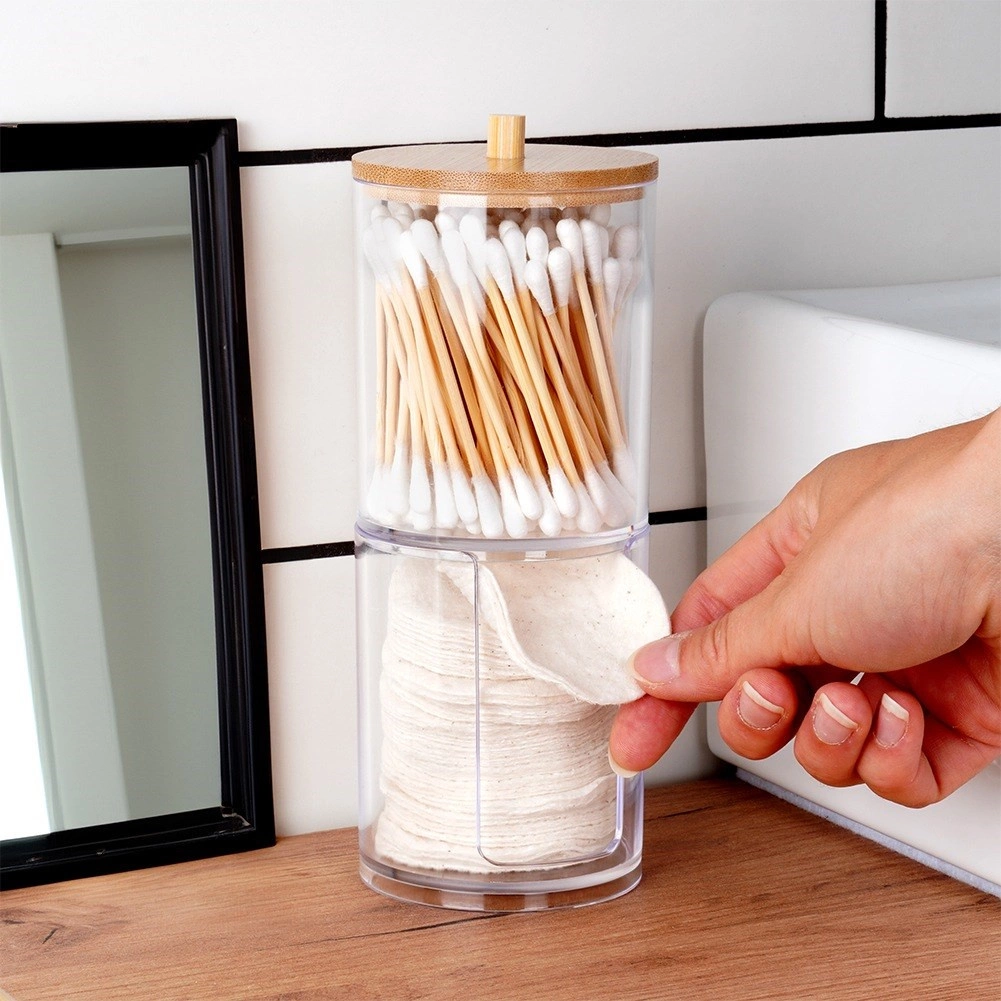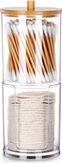 Een elegante en functionele aanvulling voor elke badkamer. Twee gescheiden compartimenten van helder acryl zorgen voor hygiënische en overzichtelijke opslag van wattenstaafjes en ronde pads. Het bovenste deel is voorzien van een bamboe deksel met greep, het onderste deel heeft een frontuitsparing voor eenvoudig doseren.