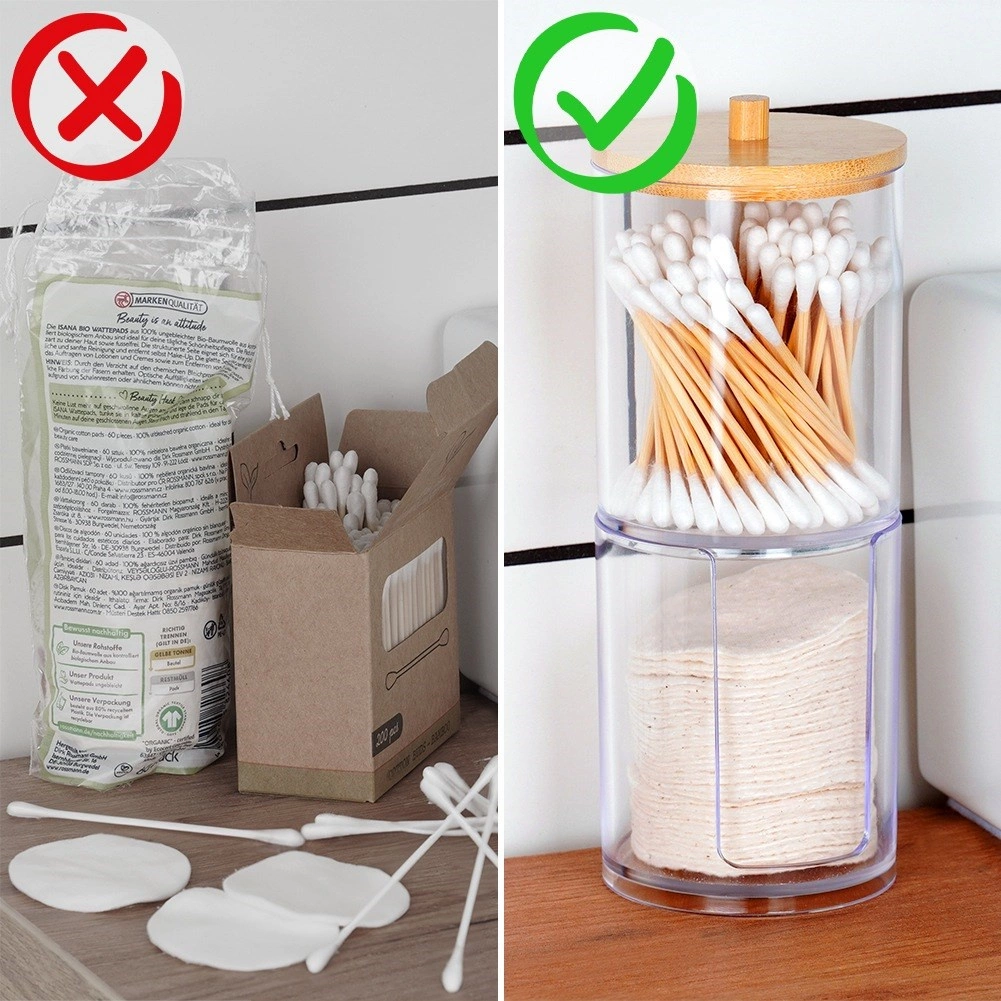 Scheid wattenstaafjes en pads in één compacte organizer. Het heldere materiaal zorgt voor direct overzicht en een elegante uitstraling.