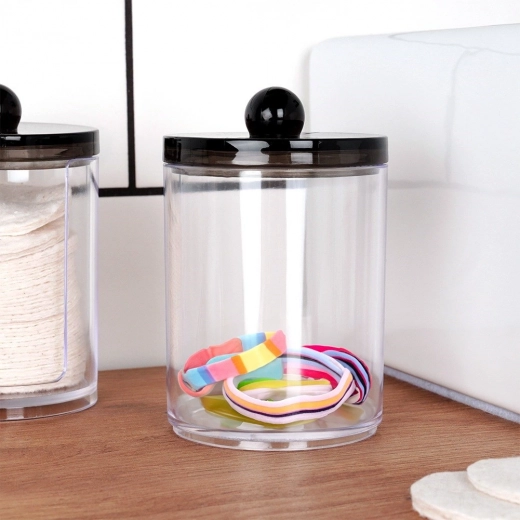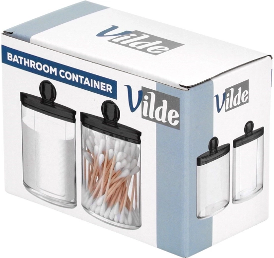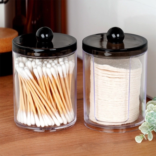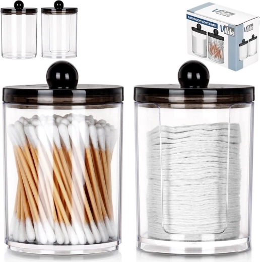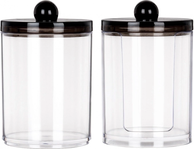 Praktische set van twee transparante acrylpotjes voor wattenstaafjes en reinigingsschijfjes. Compacte afmetingen, een hygiënische deksel met greep tegen stof en een slimme dispenser voor schijfjes voor snelle toegang. Modern, minimalistisch design dat in elke badkamer past.