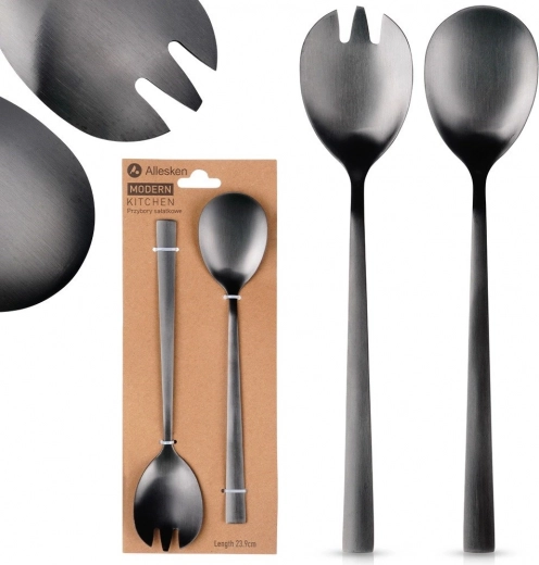 Elegante set van twee saladeservicetools van hoogwaardige roestvrijstalen in moderne zwarte kleur met een satijnen afwerking. De lengte van 23,5 cm zorgt voor comfortabel mengen en serveren van salades en andere gerechten. Universeel gebruik, stijlvol design en lange levensduur voor dagelijks tafelen en feestelijke gelegenheden.