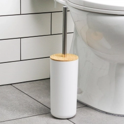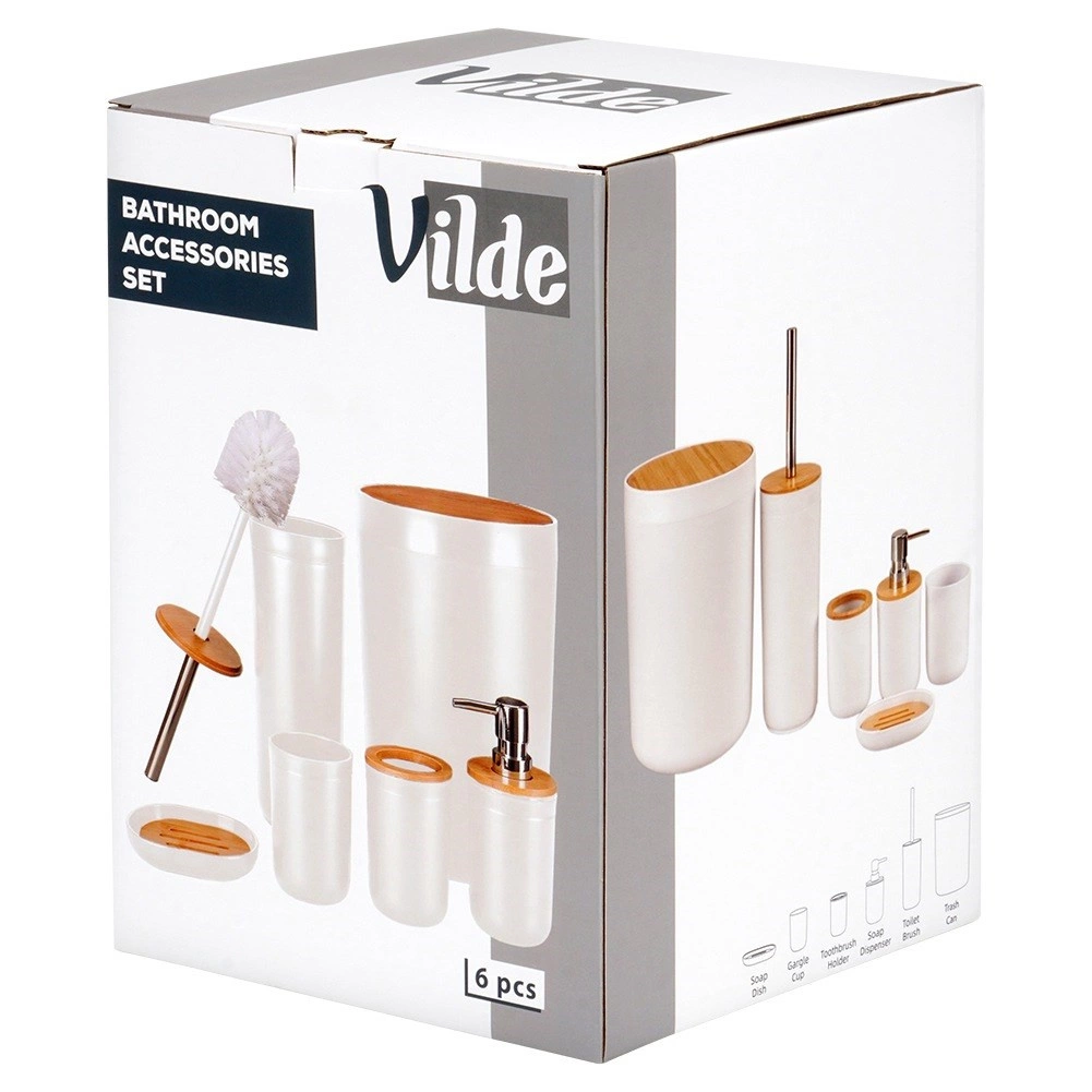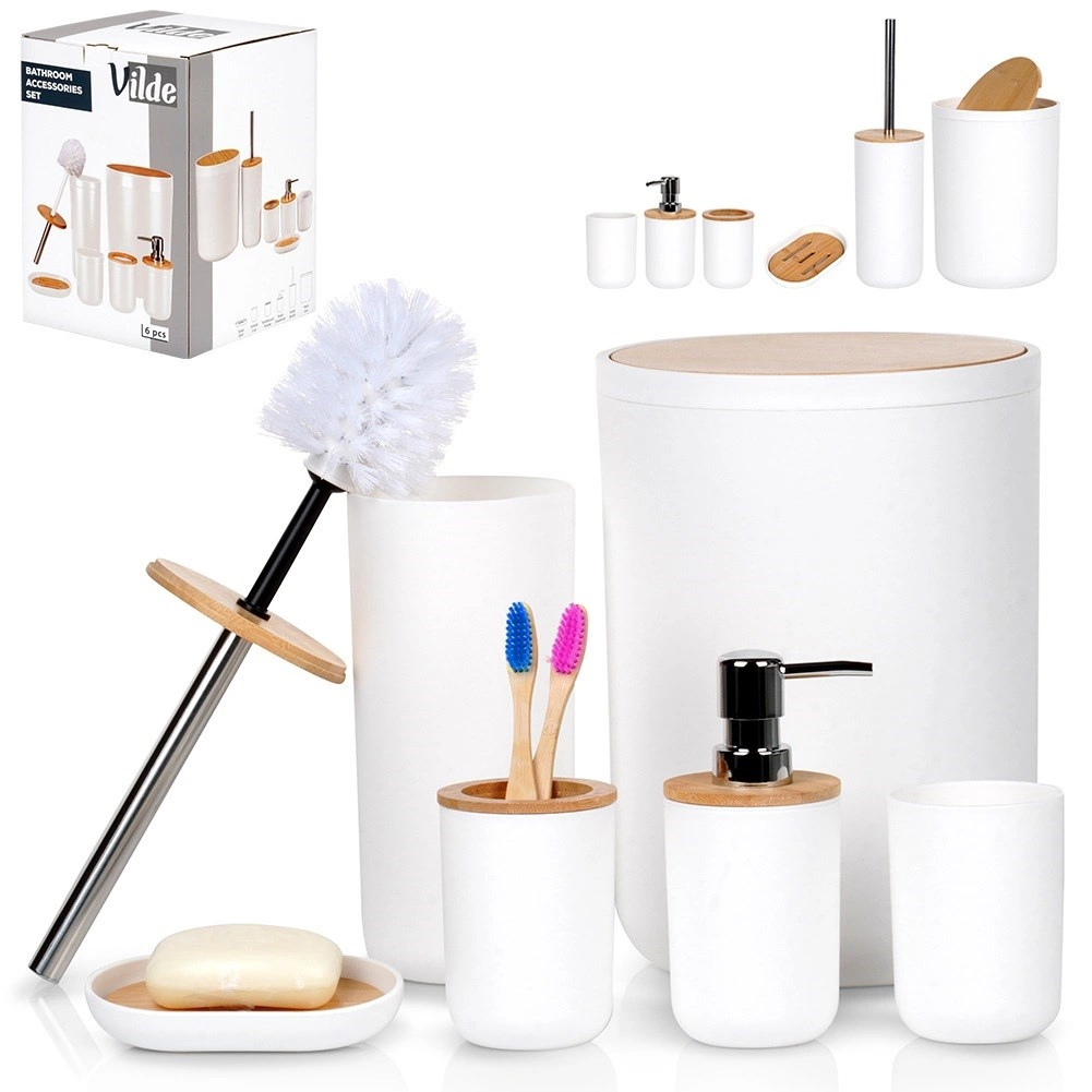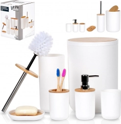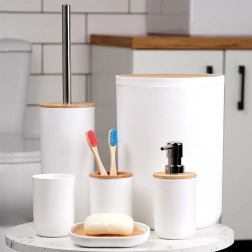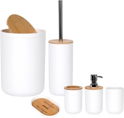 De set harmoniseert de uitstraling van de badkamer en biedt alles wat nodig is: dispenser, zeepschaaltje, tandenborstelhouder, beker, wc-borstel en prullenbak. Het minimalistische witte design met bamboe oogt warm en schoon.