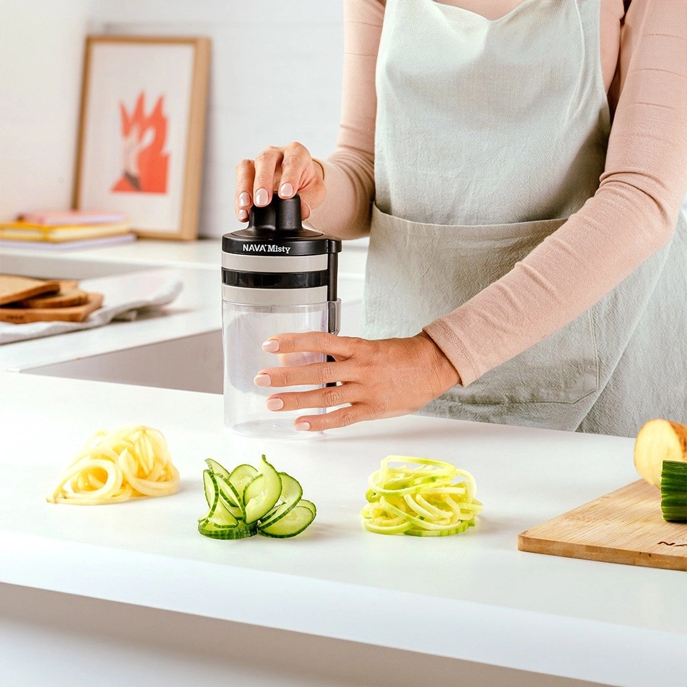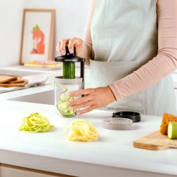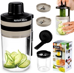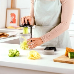 Ontdek de praktische oplossing voor dagelijks koken: de multifunctionele 3-in-1 spiraalsnijder en groentesnijder MISTY. Met drie verwisselbare messen maak je moeiteloos fijne spiralen, dunne reepjes en iets bredere noedels – ideaal voor salades, groente-“pasta”, decoraties en gezonde bijgerechten. De transparante container van 550 ml houdt het werkblad schoon en maakt portiecontrole eenvoudig.
