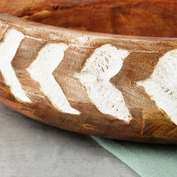 Het originele chevronpatroon accentueert de natuurlijke nerf van het mangohout en maakt van de kom een stijlvol accessoire voor serveren én decoratie.