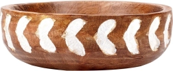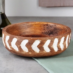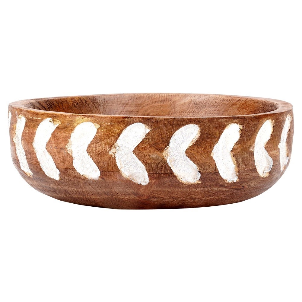 Deze kom van hoogwaardig mangohout is een prachtige aanvulling op je tafel en interieur. Het brede, ondiepe profiel maakt het serveren van salades, fruit, noten en kleine snacks eenvoudig. Een handgeschilderd en handgesneden wit patroon op de buitenrand benadrukt de natuurlijke houtnerf en geeft de kom een unieke, rustieke uitstraling.