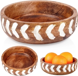 Stijlvolle houten kom van mangohout met een diameter van 20 cm en een inhoud van 850 ml, ideaal voor dagelijks serveren. Valt op door een handgesneden wit patroon, rustiek design en veelzijdig gebruik voor salades, fruit en snacks. Mangohout is bestand tegen vocht en is goed geschikt voor dagelijks gebruik.