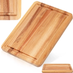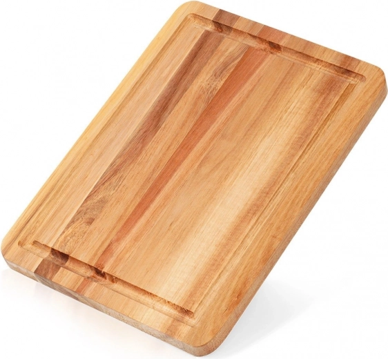 Praktische houten plank van acaciahout met afmetingen 28 × 20 cm en een dikte van 1,5 cm, ideaal voor dagelijks gebruik in de keuken. Dankzij de diepe sapgroef blijft het werkblad schoon, de plank is vochtbestendig, sterk en stabiel en perfect geschikt voor zowel snijden als stijlvol serveren van kazen, vleeswaren en groenten.