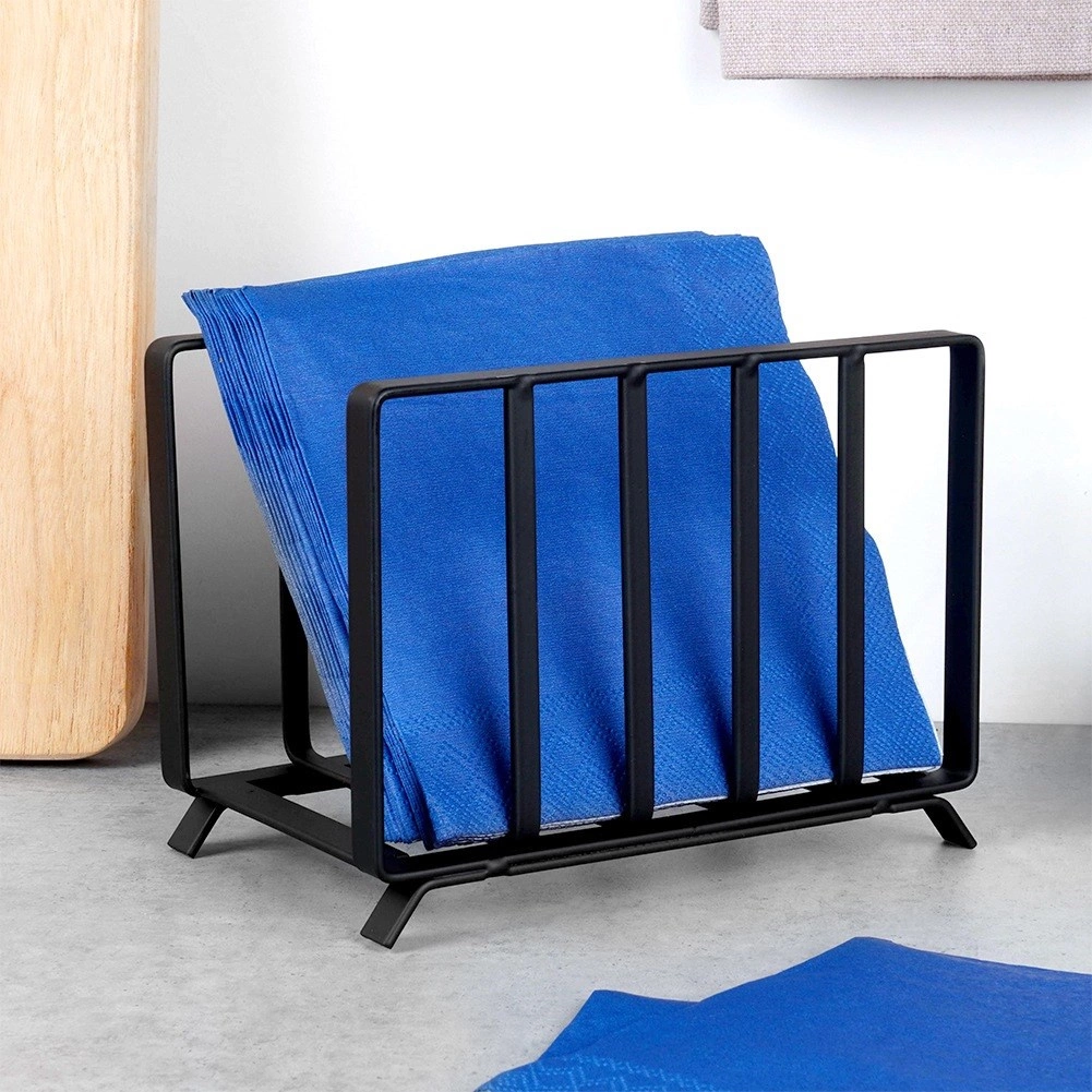 De Misty servettenhouder combineert functionaliteit en stijl. Hij is gemaakt van hoogwaardig metaal met een matte zwarte poedercoating die krasbestendig is en gemakkelijk te onderhouden. De open constructie houdt servetten rechtop en maakt snel en comfortabel pakken mogelijk.