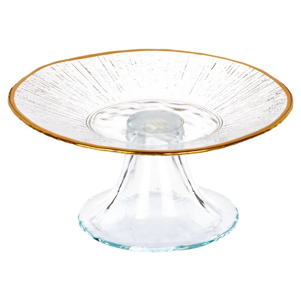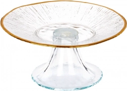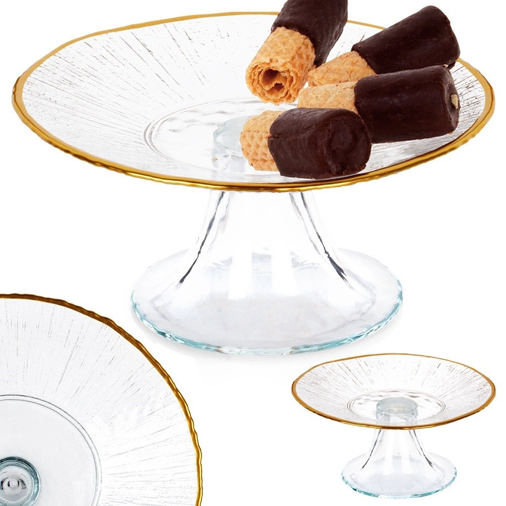 Deze compacte glazen taartschaal met een diameter van 15,5 cm en een hoogte van 7 cm is een perfecte keuze voor het serveren van kleinere porties – monotaartjes, cupcakes, koekjes of hartige snacks. Transparant glas met een subtiele textuur die aan kristal doet denken laat de kleuren en structuren van je specialiteiten uitkomen, terwijl de gouden rand een luxe accent toevoegt.
